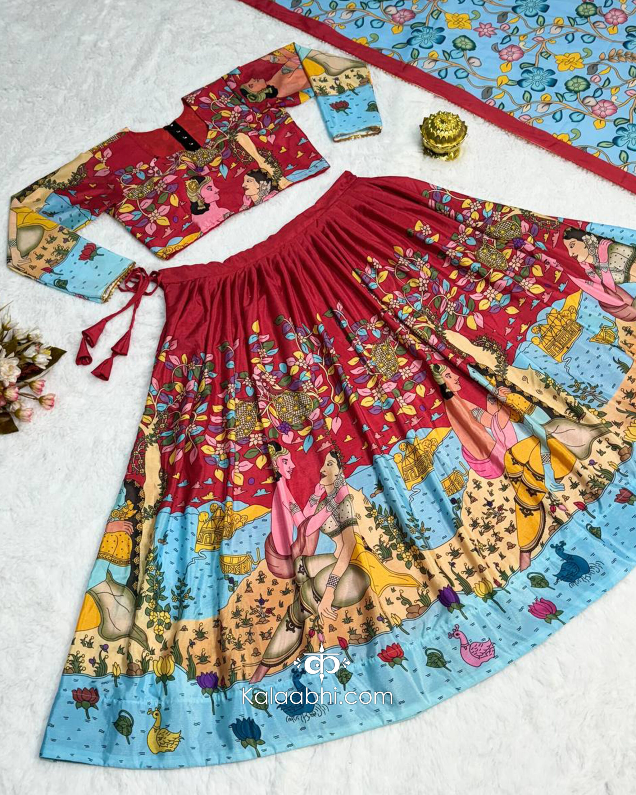 This elegant printed lehenga choli set is a beautiful blend of tradition and contemporary charm. Crafted with intricate artistic prints and rich colors, the lehenga features a graceful flare that adds movement and depth. The coordinated blouse is designed with detailed patterns, while the matching dupatta completes the look with a refined finish.