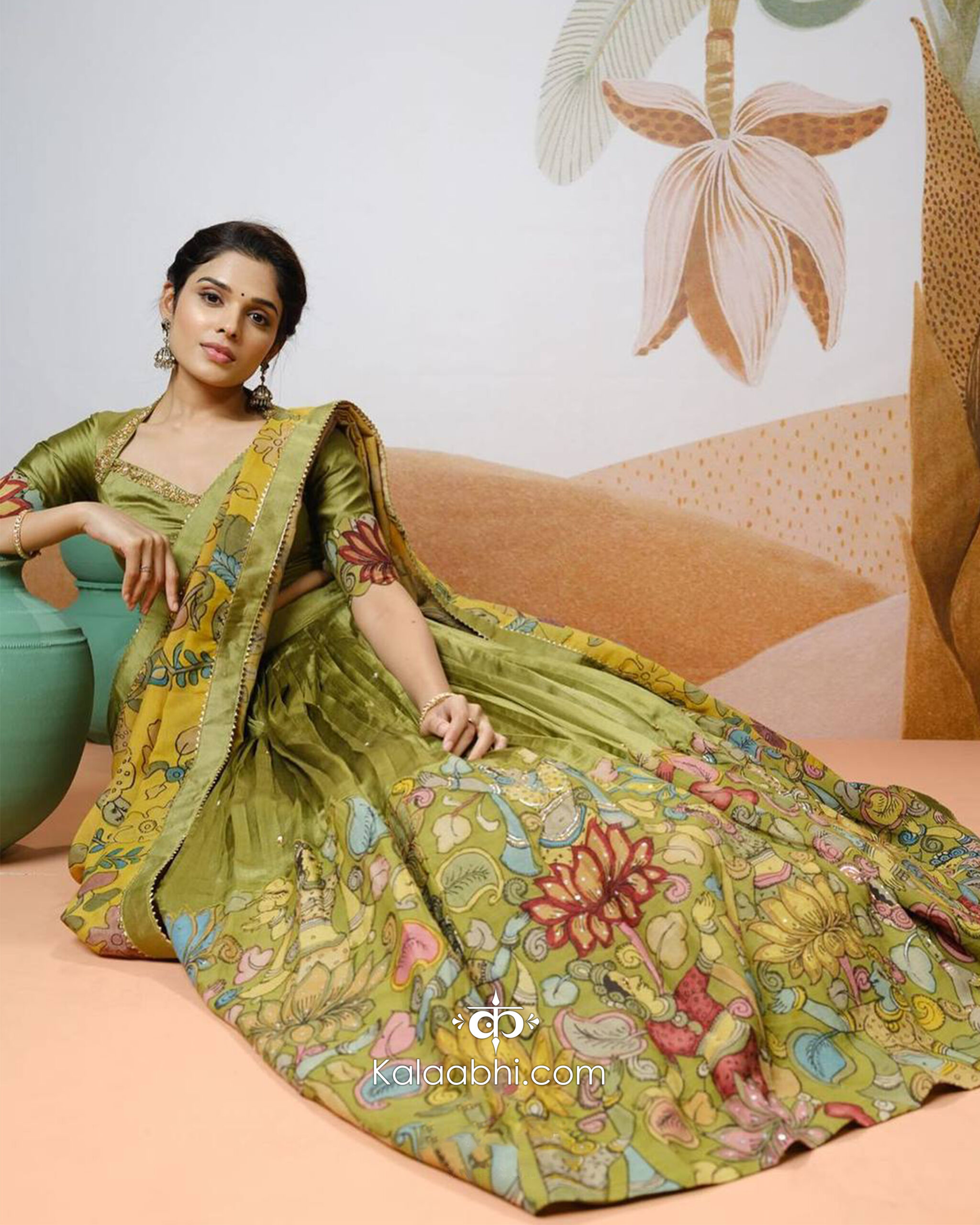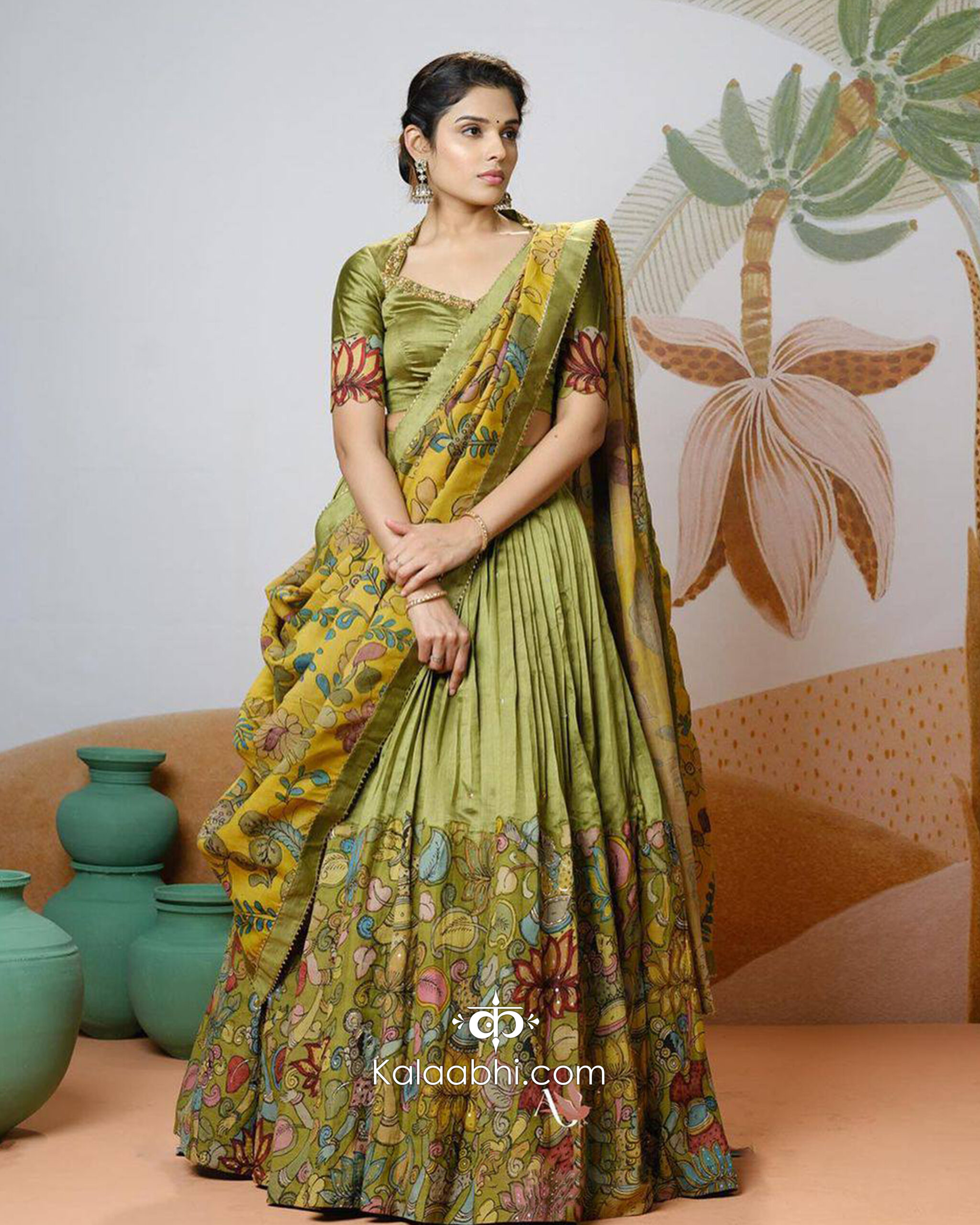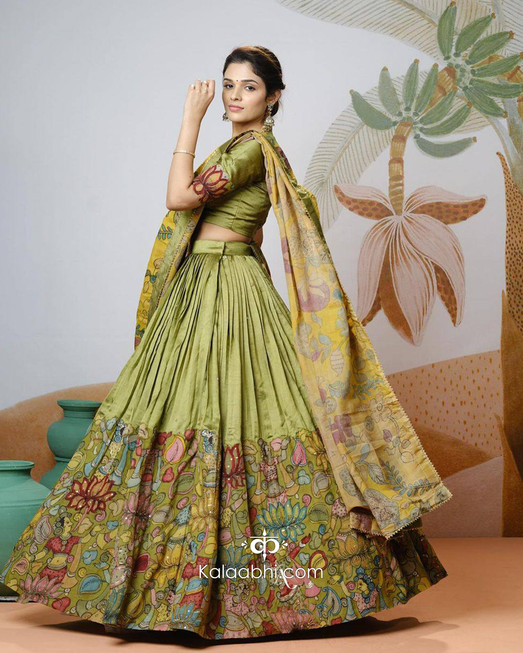 This elegant printed lehenga set showcases a sophisticated olive green base beautifully highlighted with multicolor traditional artwork and delicate floral motifs. The lehenga features fine, slim pleats with detailed vine-inspired prints along the hem, creating a graceful and artistic silhouette that flows beautifully with every movement.