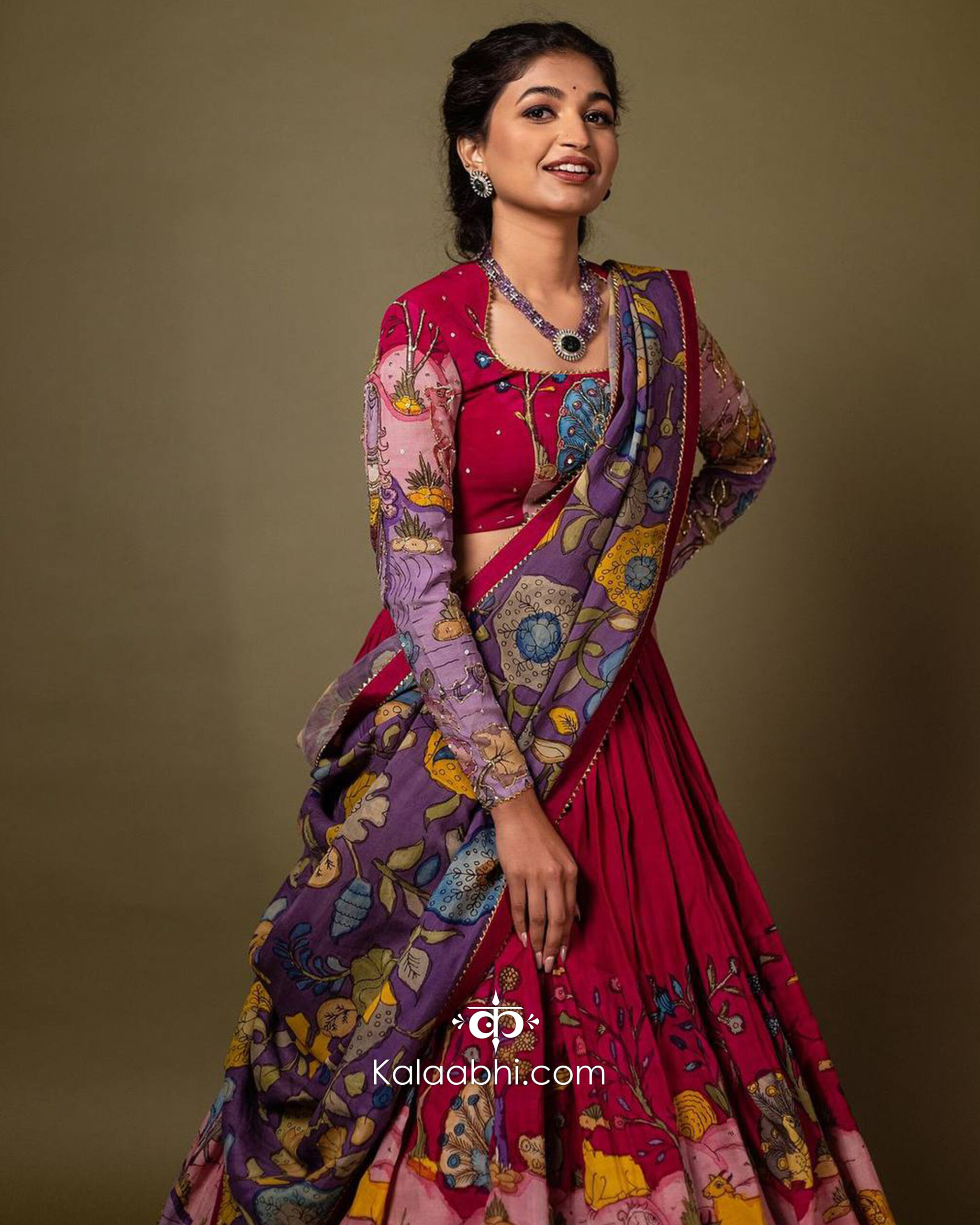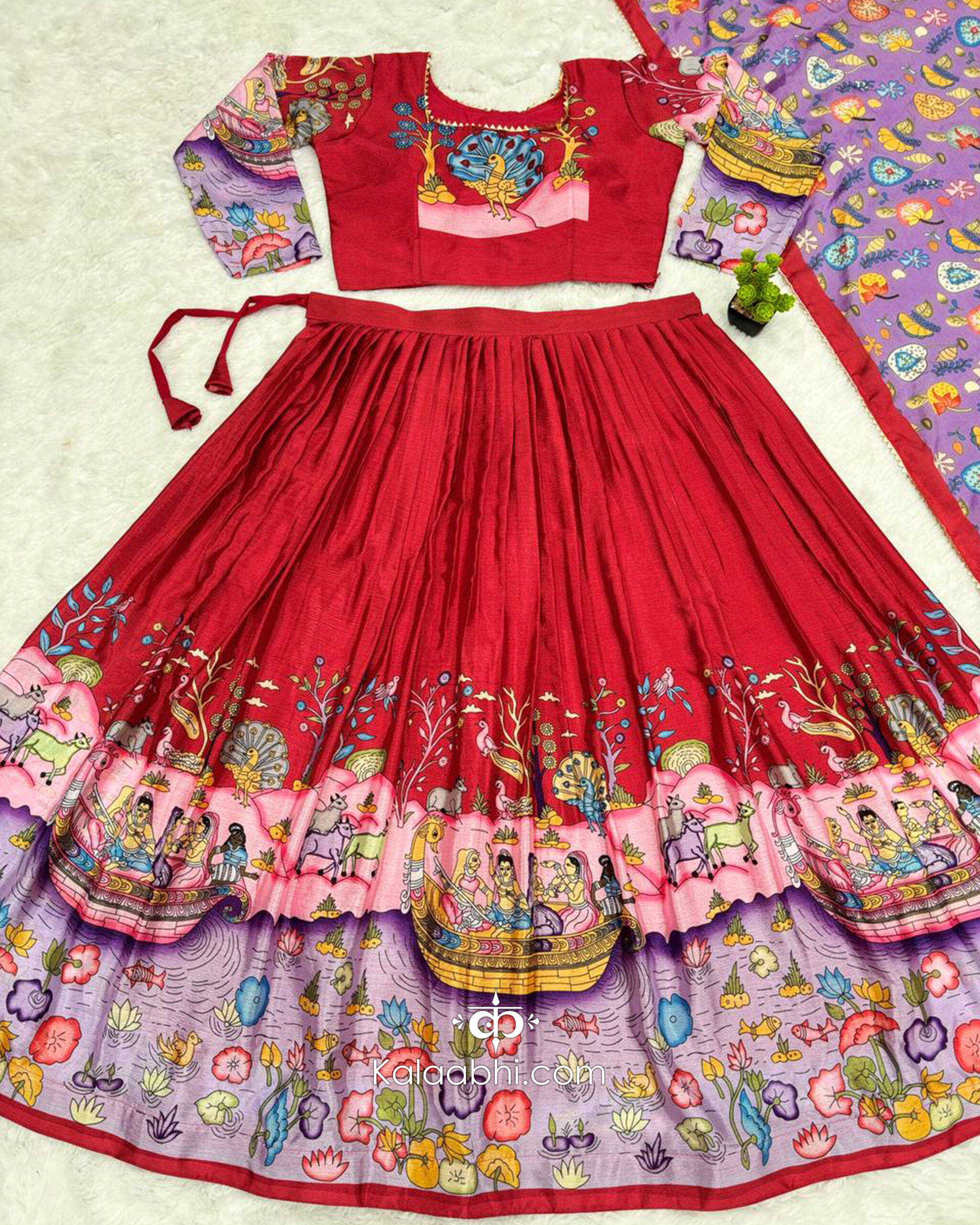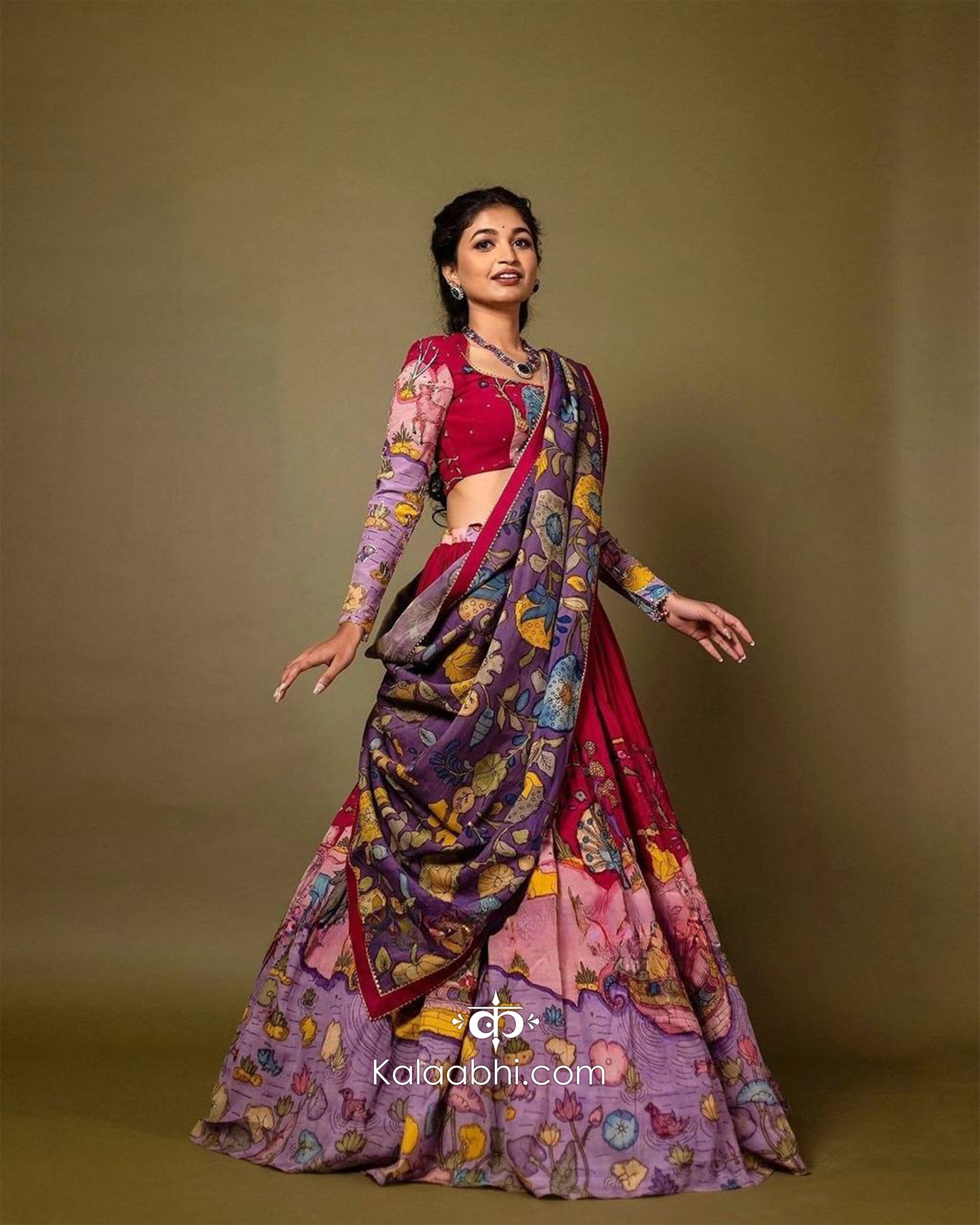 This striking Kalamkari lehenga choli set features a rich ruby red base beautifully accented with lavender tones and intricate hand-painted heritage motifs. The lehenga is designed with fine pleats and detailed storytelling-inspired artwork along the hem, offering a regal and artistic appeal.